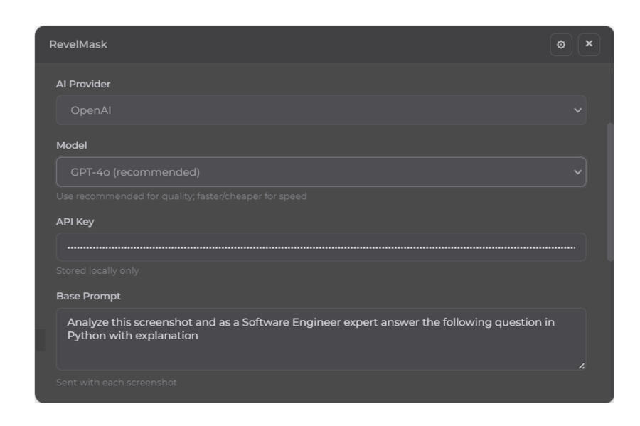 Analyze your screen quickly with AI. RevelMask stays on top, hides from recordings, and works with your own API key. Fully customizable and lightweight.
