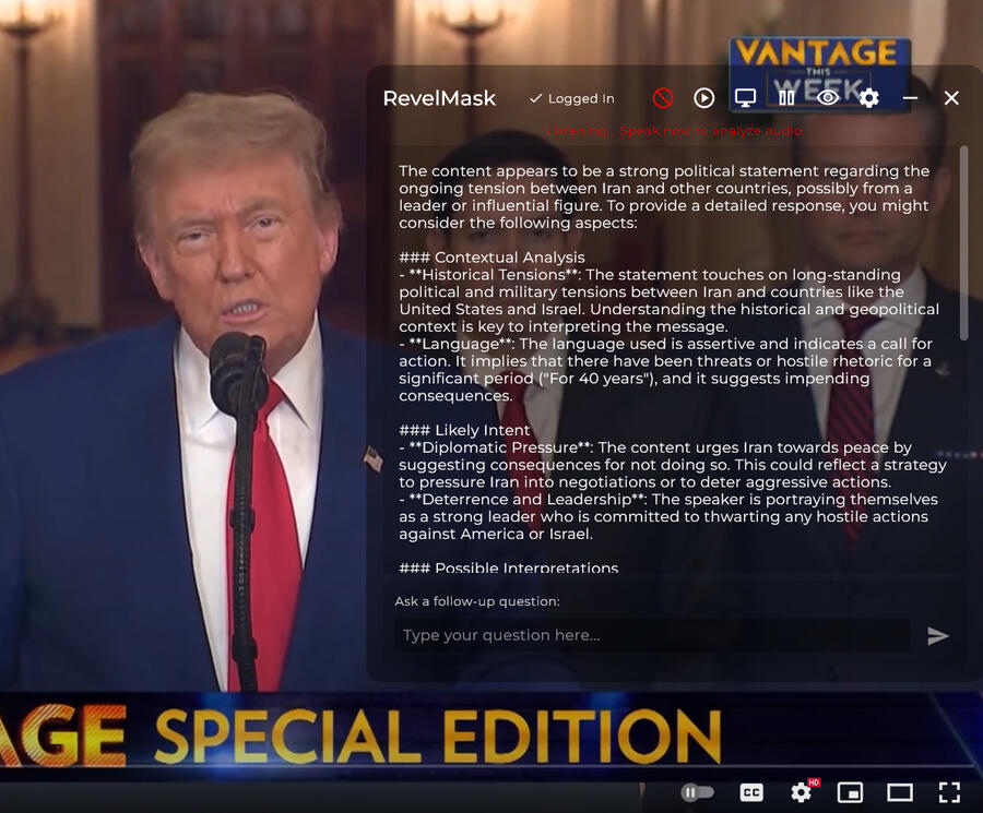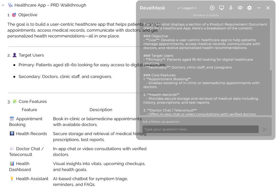 Analyze screen and audio in real time with AI. RevelMask stays on top, hides from recordings, and works with your own OpenAI key. Fully customizable and lightweight.