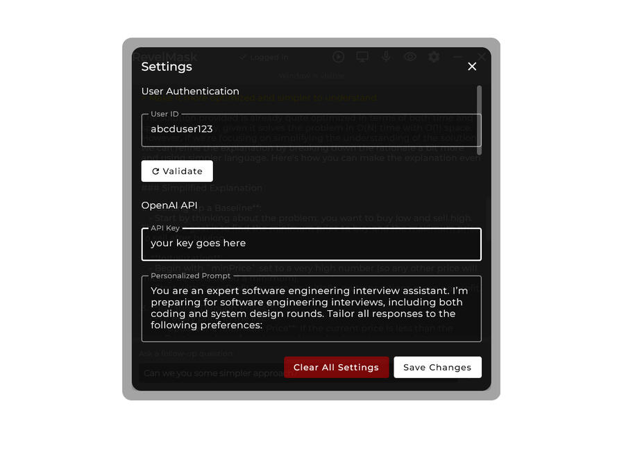 Personalize everything—modify AI prompts, font size, window opacity, and assign global hotkeys. Plug in your own OpenAI/Gemini API key for full control over model usage and behavior. Tailor the experience to your exact workflow.